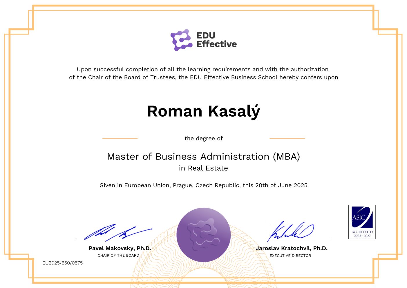 Jsem certifikovaný makléř – expert profesionál, po letech praxe jsem v roce 2020 úspěšně složil i státní zkoušku podle nového realitního zákona a v roce 2025 dokončil studium MBA – Reality. Odbornost považuji za základ důvěry, proto své znalosti neustále rozvíjím a sleduji moderní trendy i technologie v realitním marketingu.
